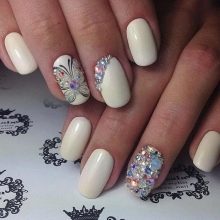 Sharp holes in the corners, decorated with small rhinestones, patterns on accent fingers look perfect in snow-white performance.