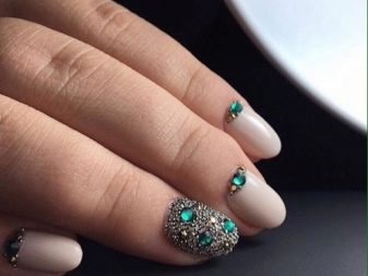 Fans of the aristocratic status style should pay attention to the exquisite composition of nude shades and stones. The shades of beige, cream, body, milk are neutral, so balance the luster and luxury of the stones.