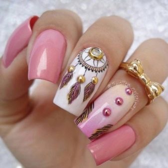 One of the most popular trends of the season is the image of a dream catcher on the nail plate. Framing in the form of stones fits perfectly into the overall mood of the design, making it brighter. This option is suitable only for extended nails.