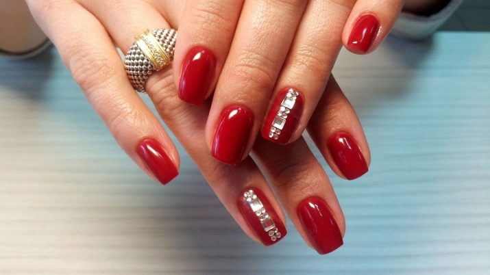 Scarlet cover is a great choice for an evening look. Rhinestones in this embodiment can act as an independent decor, or as an element of a composition of white patterned lace.