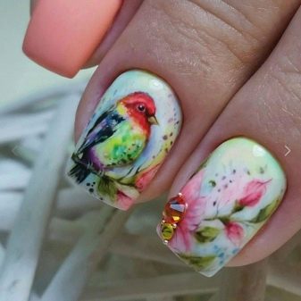 There is no need to strictly place the pattern on all nails equally. If you chose birds as an image, the chaotic arrangement will look much more interesting. In addition, it is enough to draw only one or two accent nails.