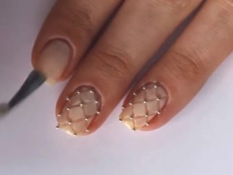 If for some reason you didn’t have any tapes, you can make a “quilted” manicure without them. You will need a thin brush, with which you will draw rhombuses. Of course, this method requires a lot of focus and some skills, but the result can be excellent if you practice a little. The sequence of actions is the same as for a manicure with adhesive tape, only rhombs are drawn manually.