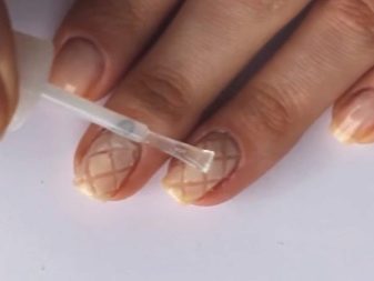 - using a tape to form a “mesh” of rhombuses, cover the nails with a layer of gel polish;