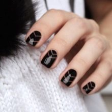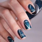 Today design with triangles is performed differently. Masters with great experience can draw triangles without any auxiliary elements. However, if identical shapes are needed in the design, you can resort to special disposable patterns or stripes. They are glued to the nails, then they fill the necessary part with the color chosen for the design and are immediately removed, and then the nail is dried.