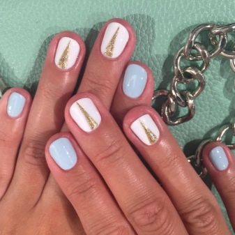 Triangular geometric shapes on straight, round and almond-shaped nails look great. For each of them, you can choose your own design options that will refine the female image. For example, you can visually give your fingers elegance by drawing a small triangle at the base of the nail and drawing a thin straight line from its top to the edge. Flat nail plates can be made more attractive by drawing an elongated triangle and adding gold or silver stripes to the sides.