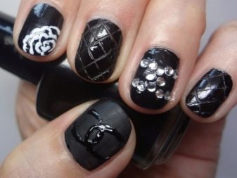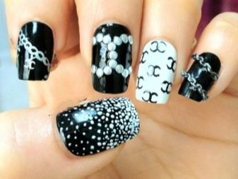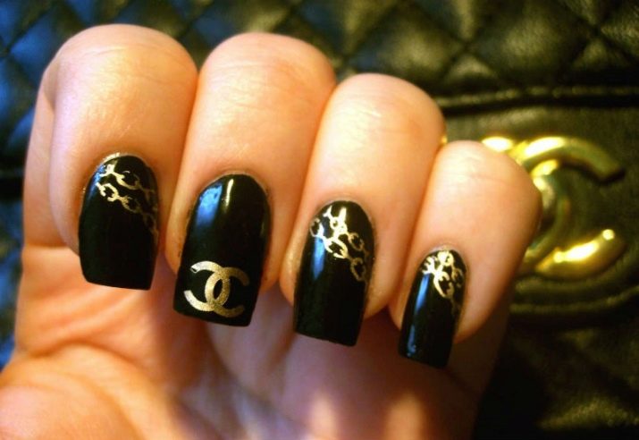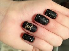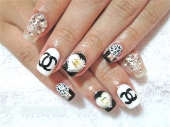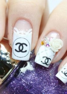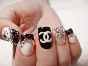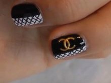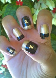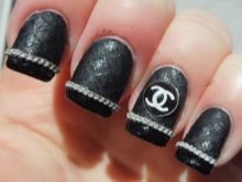 To make the black and white combination look more elegant, shine is used when performing manicure in the Chanel style. The plate shines or the logo is depicted with golden glitter.