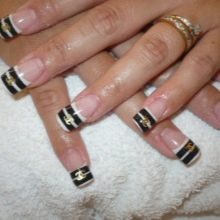To make a Chanel-style nail design, you need to prepare three shades of varnish - golden and classic shades, such as black and white. You can not do without a thin brush, with which you will apply a drawing and, of course, the finish coating.