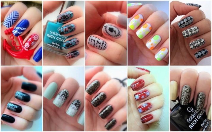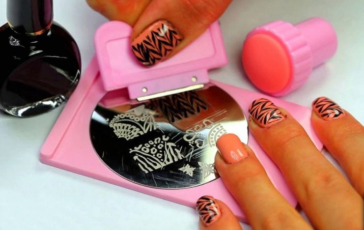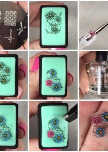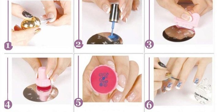 The principle of its operation is similar to stamping. All manipulations are performed using a machine made of ordinary plastic. The device has a movable part and a base, which can be fixed to the surface using a lever. The print and scraper are embedded in the movable part of the printer. A metal plate is fixed on the base. After selecting a pattern and applying paint, the movable part of the printer shifts and prints a stamp on the stamp. The finger is fixed with a nail plate at the base of the machine. The moving part moves to the nail, the stamp is lowered, and the drawing is transferred to the nail.