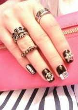 - With rhinestones. Rock and shiny stones are incompatible? But no. Rhinestones look great on a dark coating. You can diversify the style and add stones to one nail. The manicure will immediately sparkle with other colors, will become more feminine.