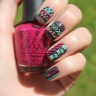 Apply a light varnish (base) on the nails and let dry. Glue the stickers carefully. Next, using a thin brush in pink, draw small patterns outside the labels (stripes, triangles, and small squares). We apply the top coat and let it dry. Literally 5 minutes of time spent, and your nails look beautiful and outstanding!