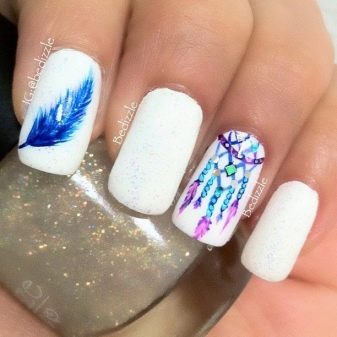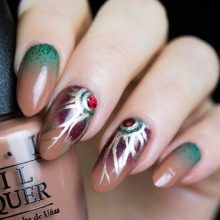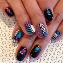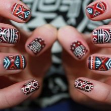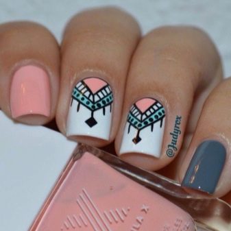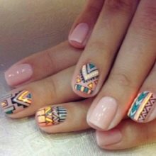 Manicure in this style is a certain mix of country and ethnic styles. Decorated with an unusual ornament, the nails look very impressive and, undoubtedly, attract the eyes of others. Such a manicure is suitable in the summer for both everyday “socks” (use calm shades of varnish as your tone) and for significant events (nails are decorated with rhinestones, colorful pebbles and sparkles).