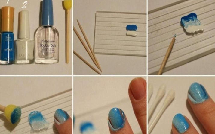 If you want to make a gradient manicure at home, then it is better to look at the first two methods. To make the vertical gradient on the nails a sponge, you should perform a series of actions: