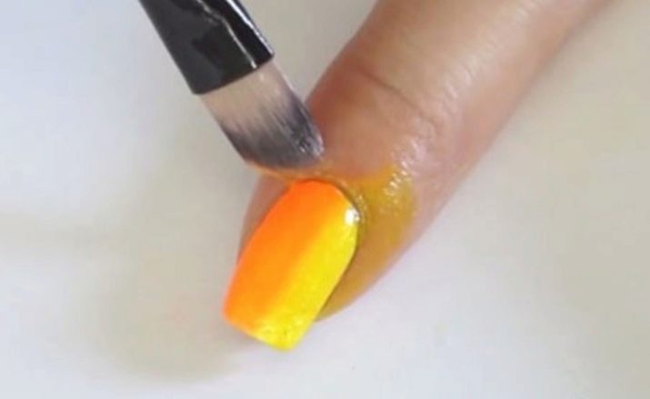 If you chose the second method and want to create a gradient with a brush, then you need to prepare your nails, and then apply a thin layer of one of the selected colors on them. Following this, apply a second color to half of the nail (top or bottom of your choice). Now you need to use a brush to create a gradient (smooth transition).