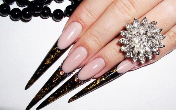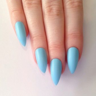 - Almonds and stiletto can be afford if the fingers are wide or short. These options will allow you to stretch the shortcomings of the short nail bed, they visually ennoble such nails, and the fingers themselves. They are good in that with a sufficient length even the trapezoidal side walls will look almost even. However, in this case, there is one significant drawback: pointed and long nails are characterized by increased fragility.