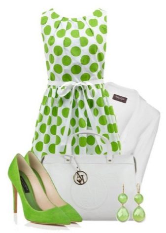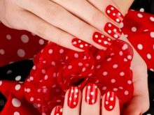 Dress with polka dots is better to complement the color of nails to match the polka dots, other experiments will not be very successful. Or choose one color, but combined with the color scheme of the dress. For example, a white dress with green peas can be complemented with green, light green, mint manicure. And yellow with blue peas will look harmoniously with blue, blue, turquoise nails.