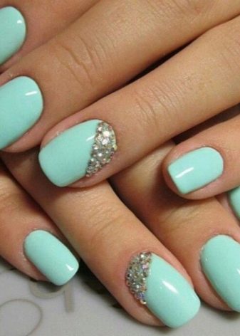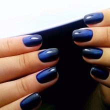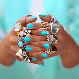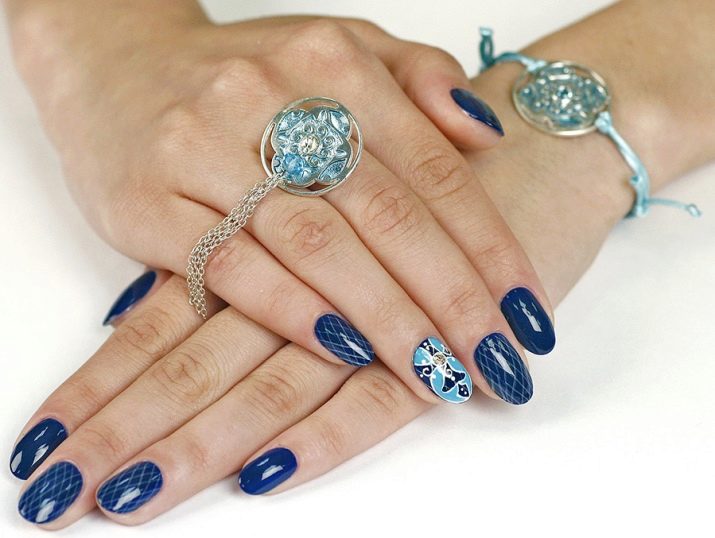 - Blue-blue manicure in combination with jewelry with blue stones looks very gentle. A silver, white or blue dress will suit this decor.