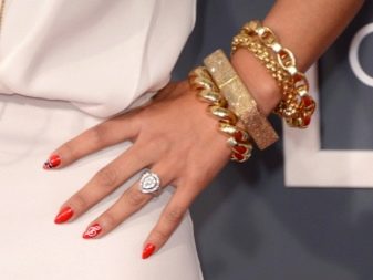 - Whatever the perfect manicure and the unprecedented beauty of the jewelry, do not overload their hands. Even if they are combined in colors, you need to clearly feel this line, where there is still beauty and style, and where bad taste is already beginning. Then one detail will be lost against the background of another and harmonious image will not be able to achieve. As in this case. Beautiful color of nails, original and catchy decorations. But it was enough to choose only one of them, and the image would be complete.