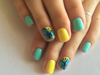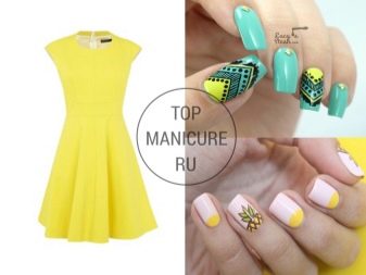 Brown tones are good for a yellow dress, yellow is not just as the main color of manicure, but just an addition. The gold coating of nails will also look harmonious. The yellow dress will harmoniously look with both pale blue and turquoise varnish.
