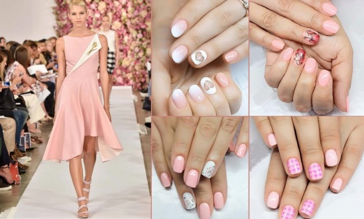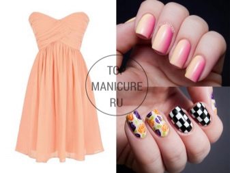 Peach, beige and powdery dresses suggest delicate colors in tune with it. In addition to the same tones, pale pink and shades of medium saturation are suitable. It is better to match white and pink manicure to powdery, to peach, if you want more brightness, you can add an orange coating, a beige outfit is good to complement with a beige nail design, but always with a contrasting pattern. Then the image will look complete.
