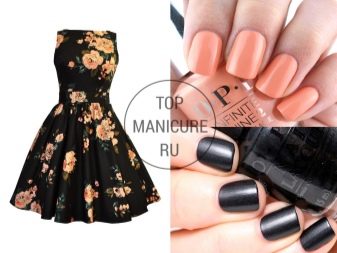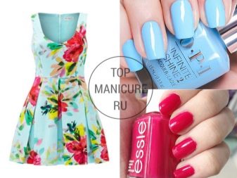 A dress with flowers should be complemented as well. If on a blue dress, for example, white-pink flowers, then a white-pink manicure would be a good option. For red flowers on a black background, a red, cherry or raspberry coating suggests itself.