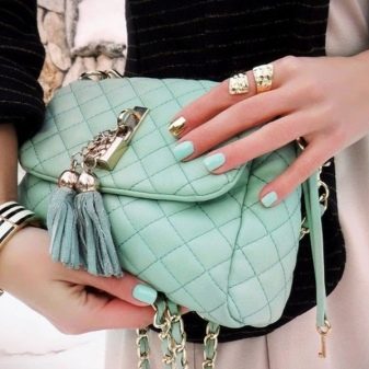 - The gold and mint color on the nails harmonize very well with the color of the handbag and golden accessories. The image looks both concise and bright at the same time. White or black dresses will come in handy here.