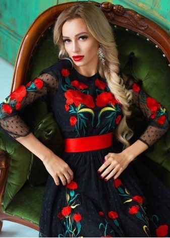 It is easy to choose the color of the coating for the red dress. But black, white, gold, silver shades will look most advantageous. Possible brown, beige, orange.