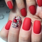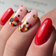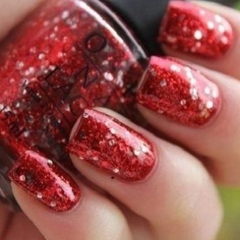 Sequins can be used as an additional glamorous decoration. or applied to the entire surface of the nail to enhance the flickering of red. Often, glitter of other colors, for example, gold, blue or black, is used for decoration.