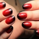 Often, masters offer their customers simplified, but no less stylish, universal options for manicure in red colors. A popular technique for creating an everyday option is ombre. It is used using a more saturated or darker shade of the same color or using a varnish of a different tone. It turns out a very unusual, but at the same time simple effect, which many girls like.