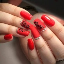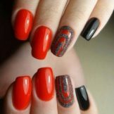 - With black color. A dark shade can balance an excessively bright shade of red and make the design of the manicure more calm and neutral. Depending on the selected pattern and execution technique, this effect can also be reversed and create a more interesting evening version.