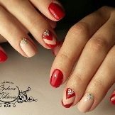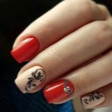 - With beige. This neutral light shade looks perfect in a manicure with dark tones of red. Most often it is either a geometric combination of two colors, or their alternate application. Often there is a manicure with a stylish pattern.