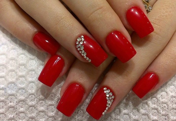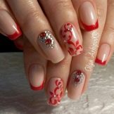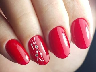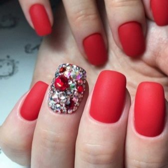 The most popular combination with red varnish. As a rule, it is used to emphasize a magnificent solemn image and to give it a highlight. Rhinestones can be attached at the base of the nail or cover its entire surface. Usually large rhinestones adorn two fingers on each hand, and all can be decorated with small ones.