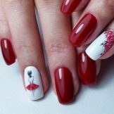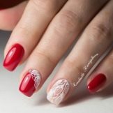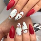 - Red nail polish on long nails looks vulgar and defiant.Such a combination in manicure is acceptable when creating an evening look, but is no longer suitable for going to work or for everyday life. It is permissible to use in this case a dark shade of scarlet or burgundy in combination with other neutral shades, for example, white, gold or beige.