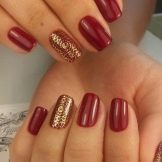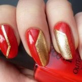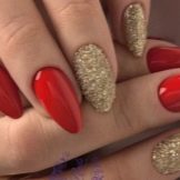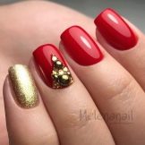 - With gold. Gold in conjunction with red is an ideal option for creating a luxurious, memorable manicure. With it, you can complement the evening look and attract the attention of others. Most often, masters propose to decorate the red design with gold sequins or rhinestones, which add a special charm to the manicure.