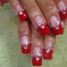 - A red jacket on nails with a pattern is best suited for girls who have beautiful hands with long fingers and a neat nail plate. Defiant red shades made in French manicure will in most cases look inappropriate on the hands of a mature woman.