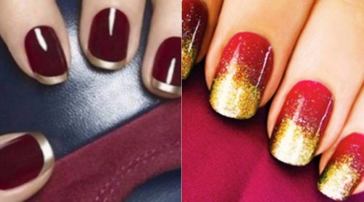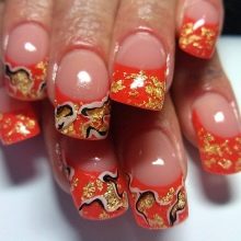 Glitter on the nails has long been loved by many girls, because with it you can add a luxurious sparkle. Gold glitter is especially popular. With its help, often create beautiful ornaments and patterns in addition to traditional French manicure. In this case, the arc itself is most often formed in red, and the drawing goes along the edge or branches to the cuticle.