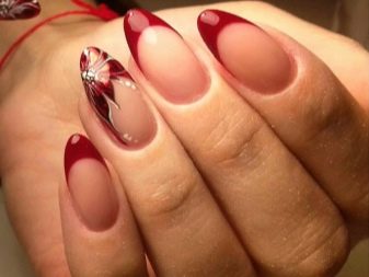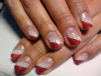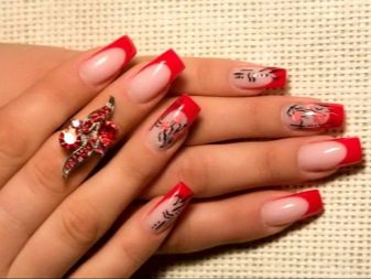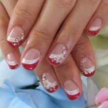 Classic French manicure looks everyday and rather pale for a solemn exit. That is why at present, nail service masters offer their clients such a manicure, made using a varnish of a luxurious red hue. Depending on the design, such a French manicure can be used to complete office and holiday images.