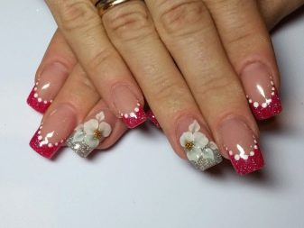 The picture itself can be designed in different ways. But as a rule, French manicure has inherent smooth and light lines that only slightly emphasize the overall composition. However, modern manicure variations allow for more interesting and voluminous variations up to the believable image of individual elements, for example, flowers or leaves using different techniques and techniques.