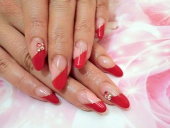 Often, girls prefer small patterns made of rhinestones of small size. In combination with red, they look luxurious, effectively completing the image. Most often, they are attached either at the cuticle or at the tip of the nail, forming an interesting iridescent ornament.