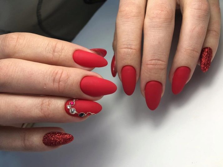 One of the most common is considered a red matte manicure. Its color emphasizes the romance and passion of female nature. So, younger female representatives prefer more delicate shades of this color, using pink or raspberry shade. And older women prefer to decorate their nails with dark shades of varnish, for example, burgundy or bright cherry color. And they both look great on nails.