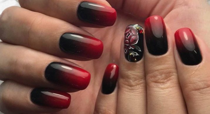 One of the options for black and red manicure is an ombre manicure, which is done using sponge at home. Black and red gel polish is applied to it, so that they touch each other and merge slightly, then the sponge is pressed to the nail and the varnish is imprinted on the nail plate.