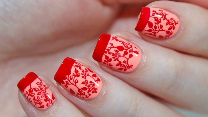 Red-pink manicure is relevant in the summer on vacation.Both colors are not contrasting for each other, so turquoise, white or black pigment should be used for a better union with each other. The decoration can be placed on each nail or only one or two.