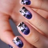 When choosing a background from only one shade, the palms will look amazing throughout the entire period of wearing a manicure, in addition, drawings on a monophonic basis are very stylish. You can choose any interesting shade: purple or yellow, blue or pink. It is also worth trying pastel shades. A beautiful and even excellent background for exotic palm trees will be, for example, ombre.