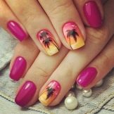 Palm trees can be drawn against the backdrop of the beautiful sea coast in combination with several shades. Exotic palm tree will look luxuriously on the background image of emerald skies with snow-white clouds - it will be a real masterpiece.The sky at sunset can be lit up in red and bright orange colors. You can draw the sea - it will be an excellent and even charming landscape right on your nails. In addition, you can portray the sun, sunset or dawn - all this fits perfectly into the nature, which is surrounded by exotic trees.