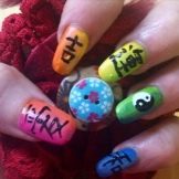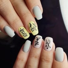 As we already said, this is usually called either all the same Chinese characters, or syllabic alphabets. Unlike hieroglyphs, alphabets have fewer features, so it’s easier to put on nails, but few of them with a single sign indicate a whole word. Therefore, such a manicure will have to be carefully thought out and, possibly, broken into several nails.