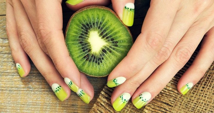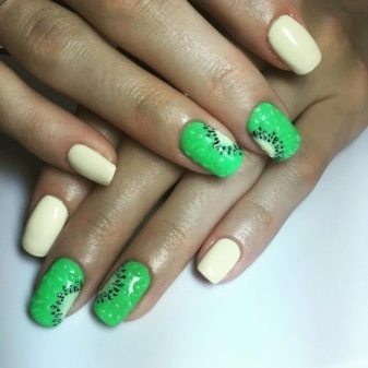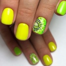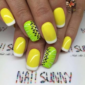 Manicure design options are limited only by the imagination of the master or client. To draw a kiwi on each nail will not please everyone, since this is a matter of taste. Often the image of the fruit is done on only a few nails, all the rest are covered in a uniform color or a jacket is made. If you choose the option with French manicure, you can make it not standard white, but, for example, bright yellow or, conversely, black.