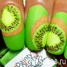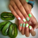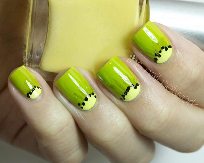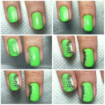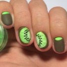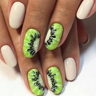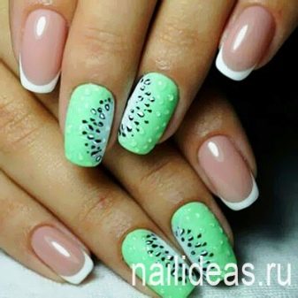 Such a fruit as kiwi will go well with French manicure. To do this, all nails are covered with one green edema, after which white ovals are drawn on the tips, from which white stripes, similar to the rays of the sun, are drawn with strokes. Small black dots are made between these rays. Alternatively, you can draw a kiwi on half of the nail plate.