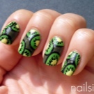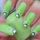 To do this, the nails are covered with monophonic varnish, which goes well with greens, after which a half-circle of green color is drawn on the tip to half, in it another one is white, but with a smaller diameter. Next, strokes are drawn from the center of the white semicircle and black dots are set.