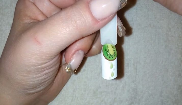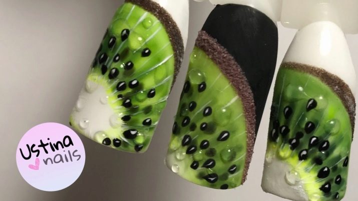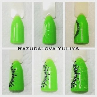 It looks spectacular when the fruit is painted on the side on two nails - middle and nameless - so that the middle of the kiwi look at each other, creating the effect of the image of the fruit in the section. The background on these two nails turns green, and white semicircles are drawn on each of the fingers from different sides, so that together they look like a whole circle. And so the technique of performing the drawing remains unchanged.