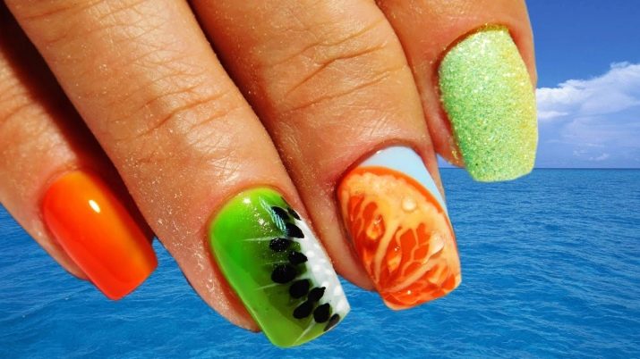 Which design to choose is up to you. There are a huge number of them, it all depends on skills and imagination. Fruit manicure remains the real trend of the summer season for many years. The color scheme can be different: from the brightest and most poisonous colors to more delicate and pastel shades. Such a design will be the highlight of any image. A light silk dress or stylish high denim shorts and a torn tank top, heeled sandals or comfortable sneakers - any image of a manicure with fruits will make it even more vivid and memorable.