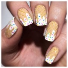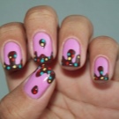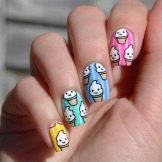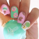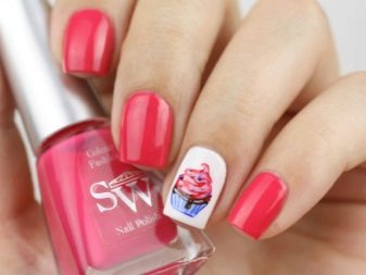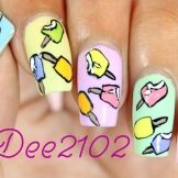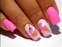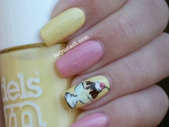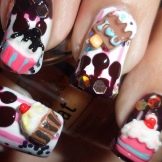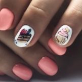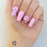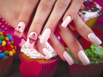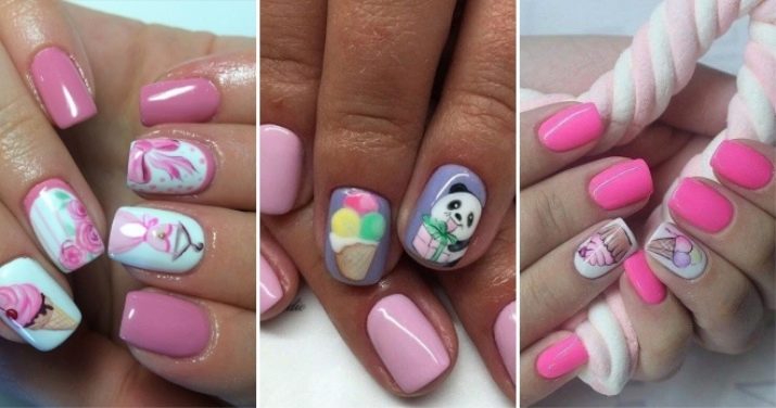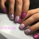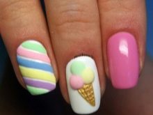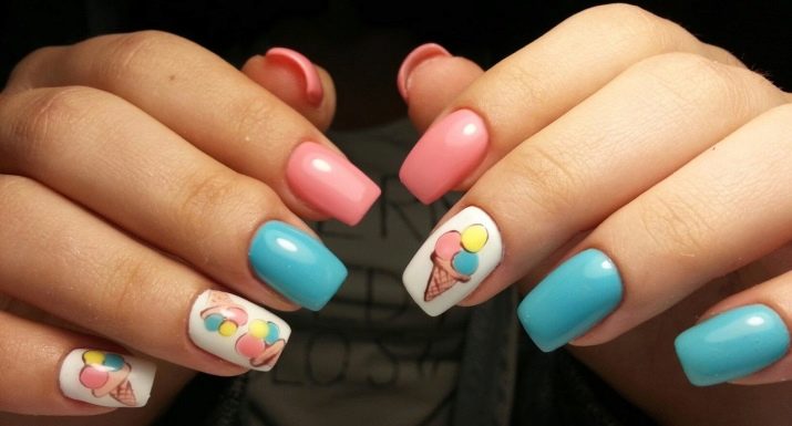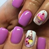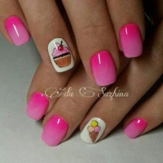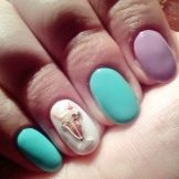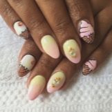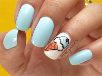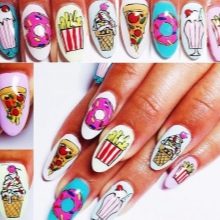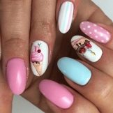 - When combining several types of images in one manicure, for example, a duet of ice cream with a cake or ice cream with a donut, it is worth performing them in one color palette. In order for the difference in the patterns to be noticeable, it is advisable to give preference to a single-color coating of the nails with a drawing on one finger on each hand.